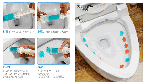 其中块状的洁厕宝直接放入厕所水箱,瓶装的凝胶洁厕宝撕开封口条后再放入水箱,小花凝胶则是使用凝胶管将花朵凝胶打至厕所内壁上。
